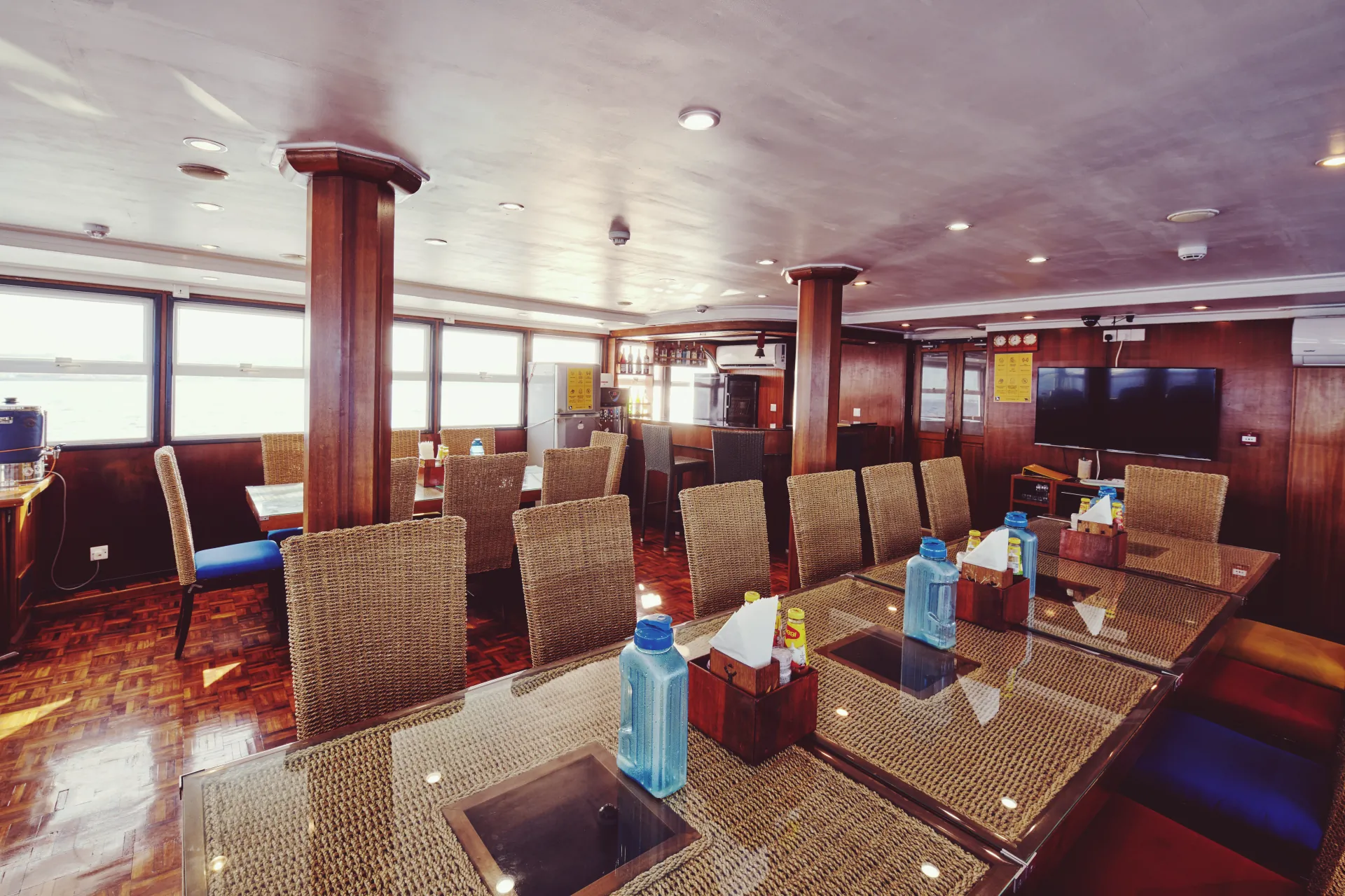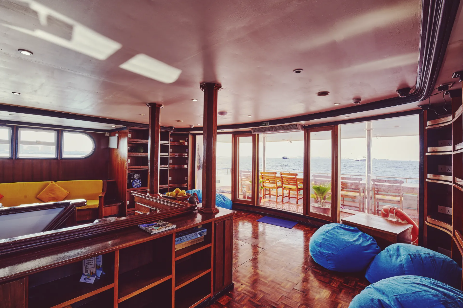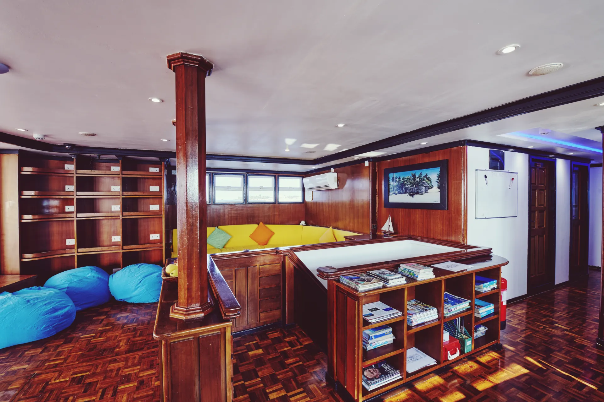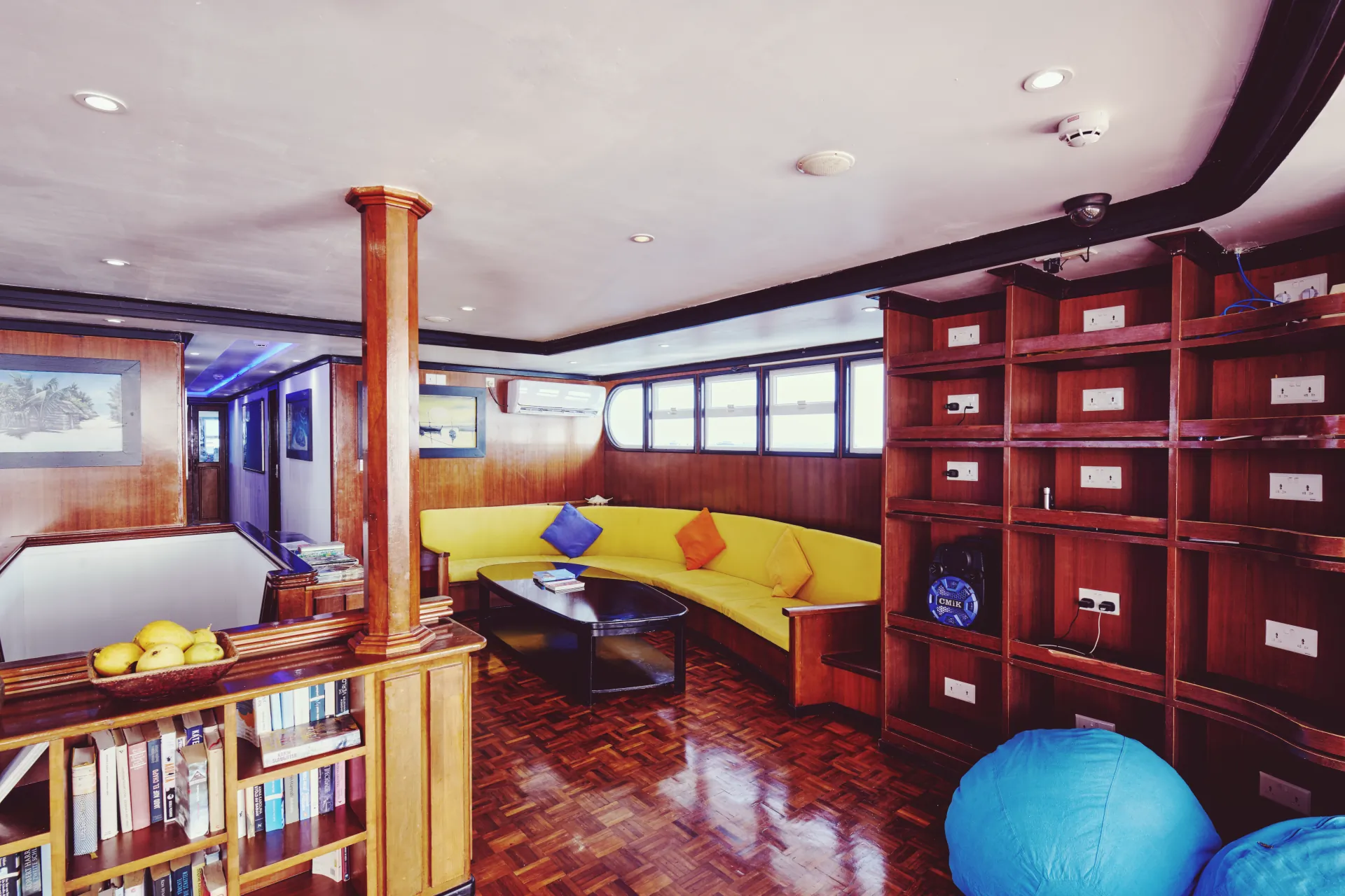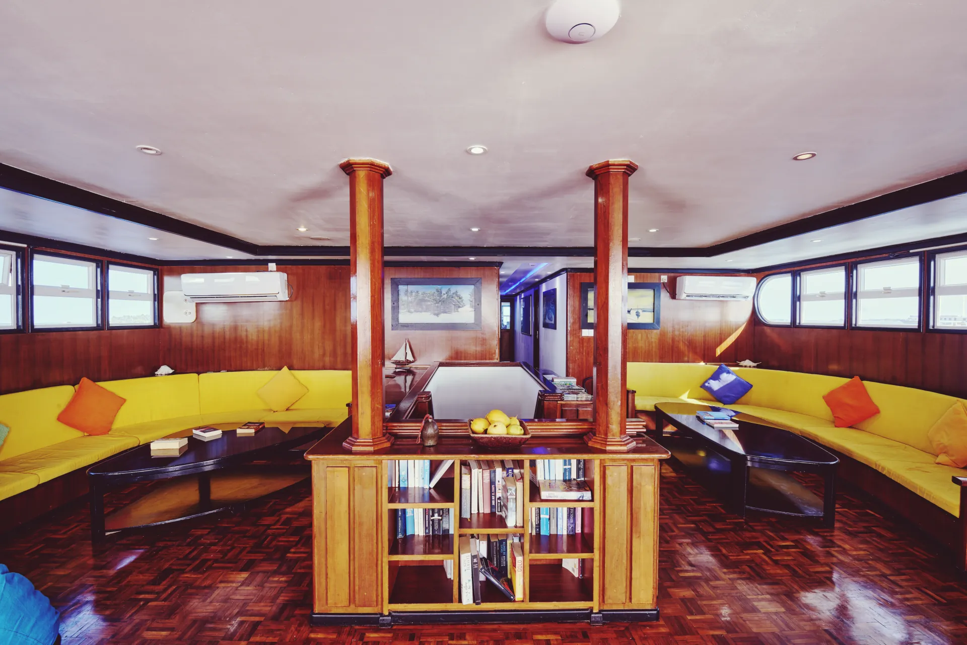 - Главная палуба: Кондиционированный салон; удобные диваны, телевизор, книги, музыка, кресла-мешки, бар с международным ассортиментом, обеденная зона.