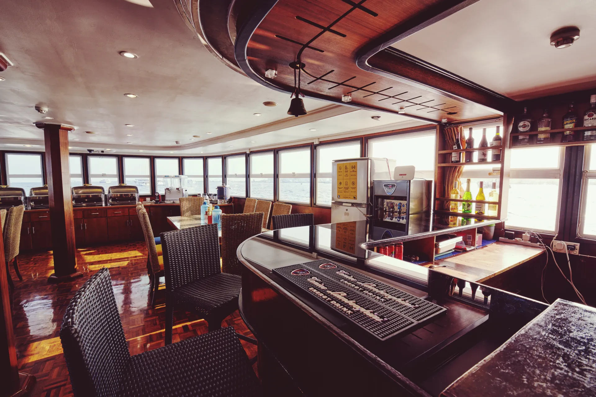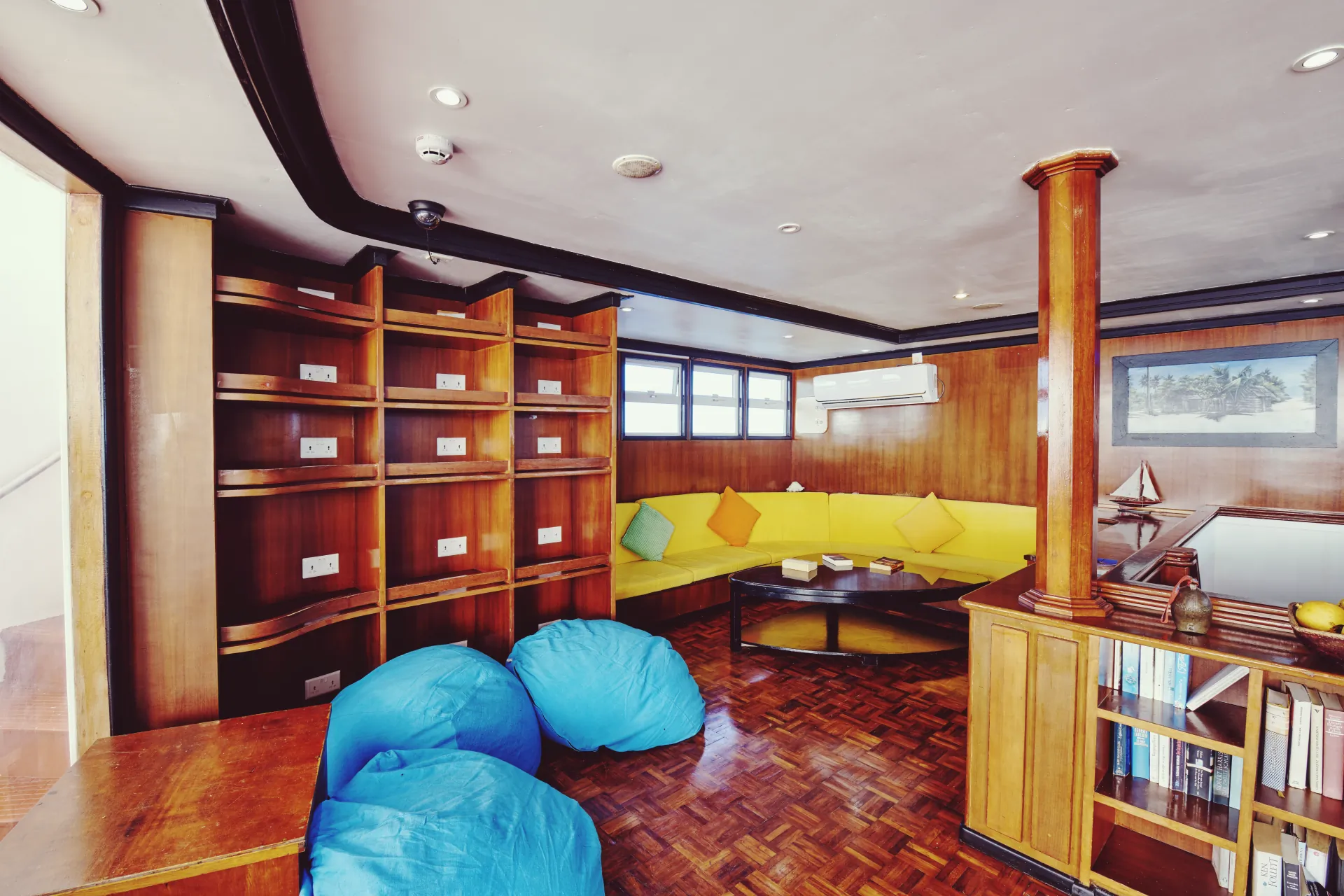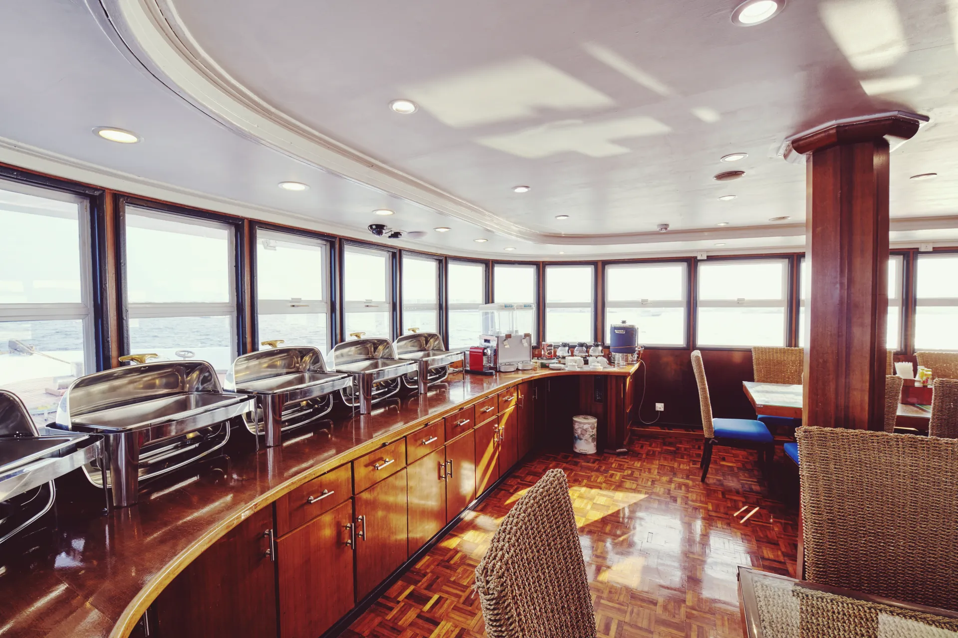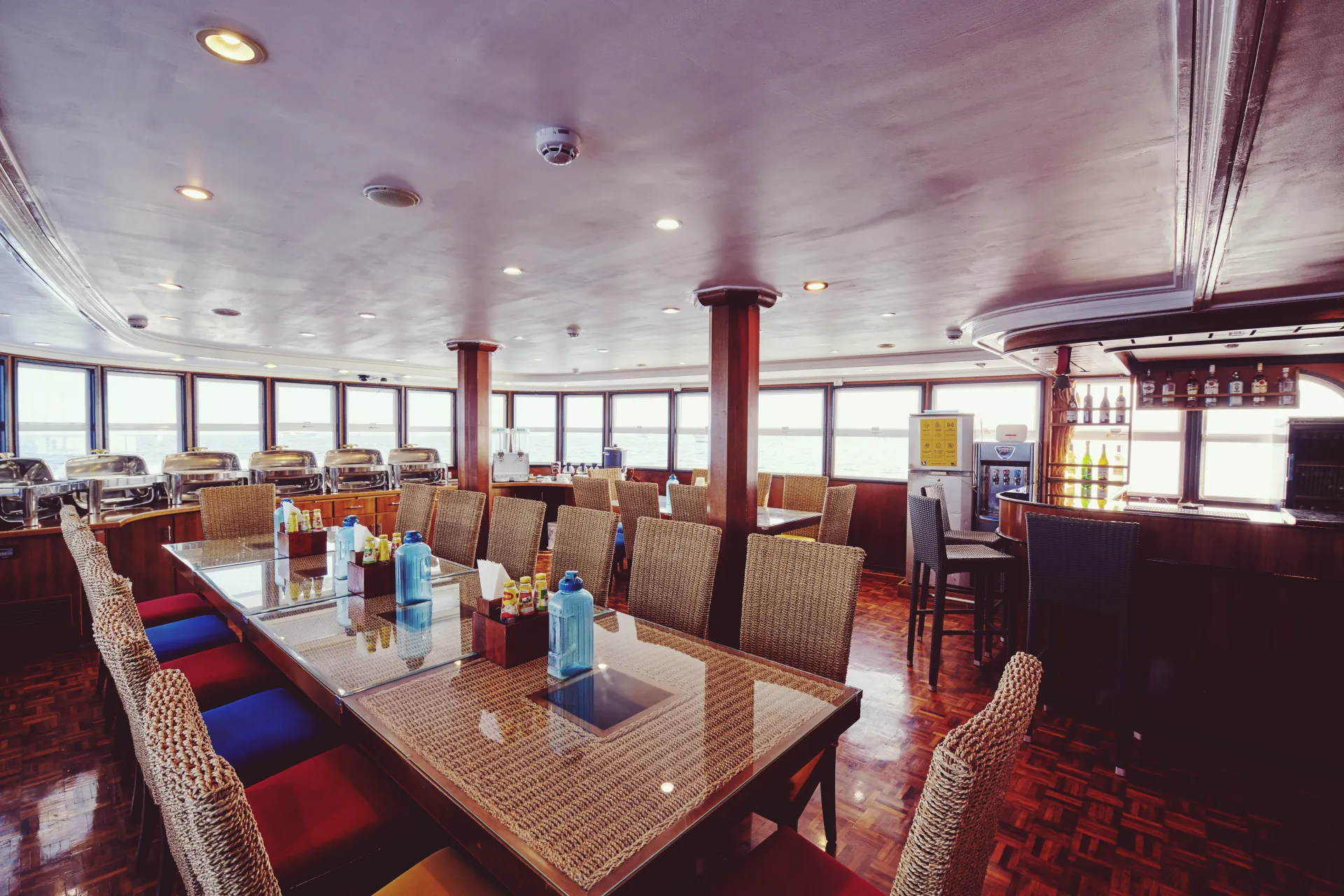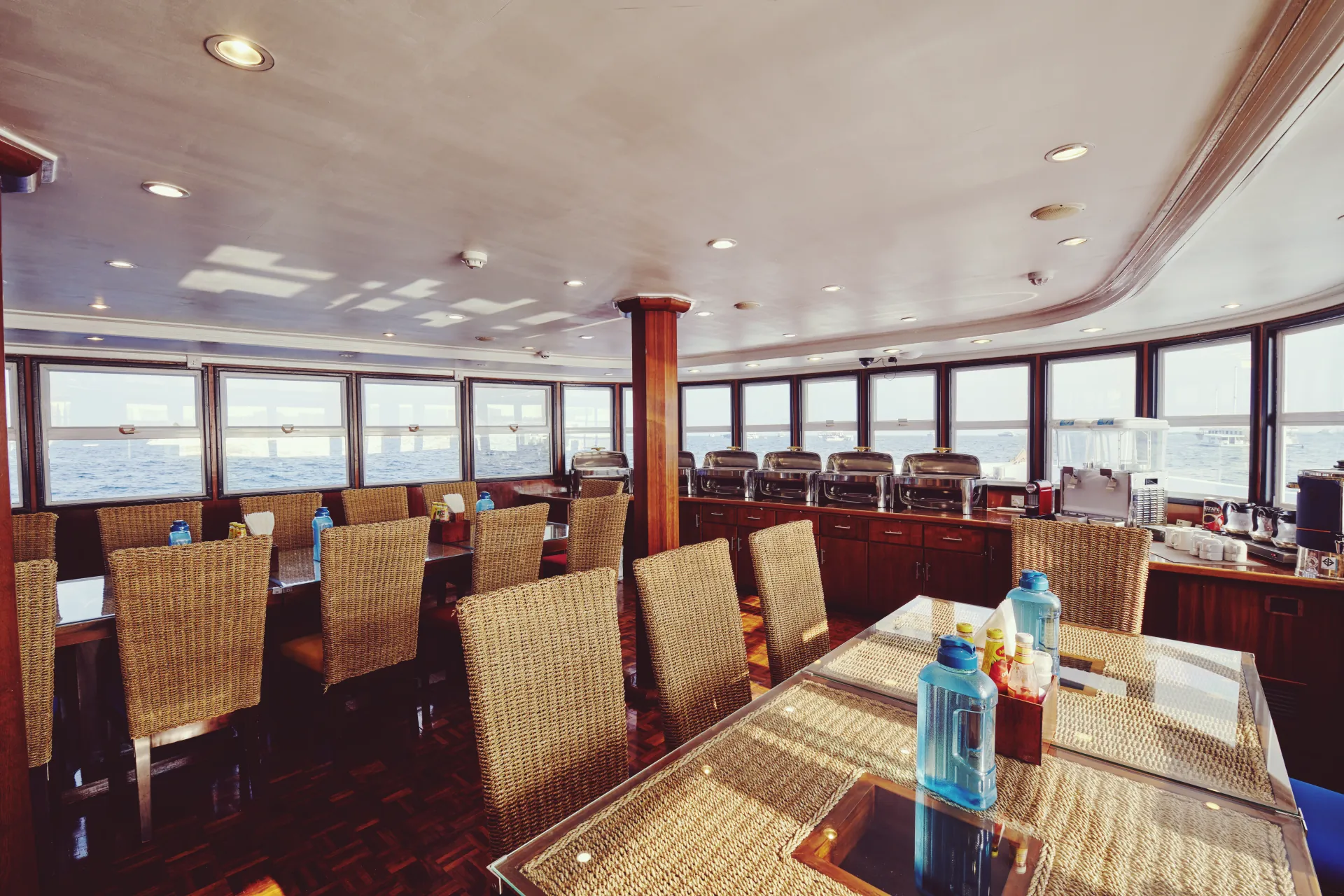 - Главная палуба: Кондиционированный салон; удобные диваны, телевизор, книги, музыка, кресла-мешки, бар с международным ассортиментом, обеденная зона.