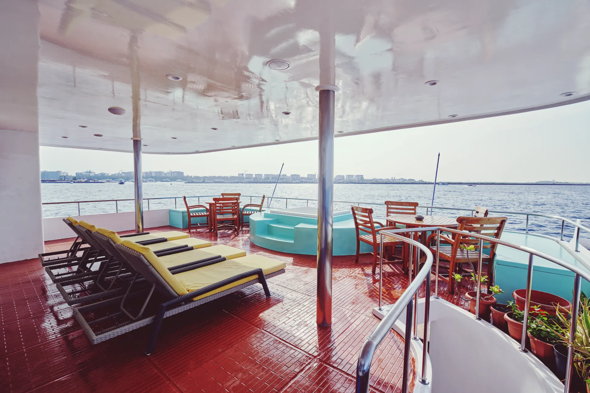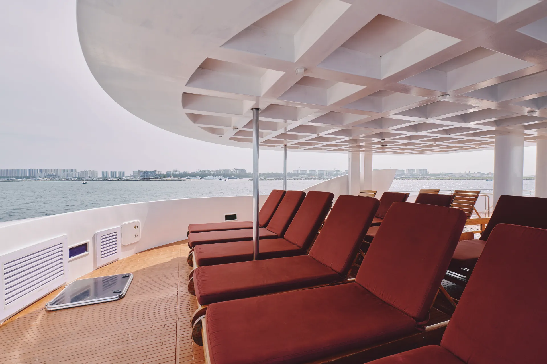 - Верхняя палуба: Открытая зона отдыха с шезлонгами, открытая гидромассажная ванна, лежаки.